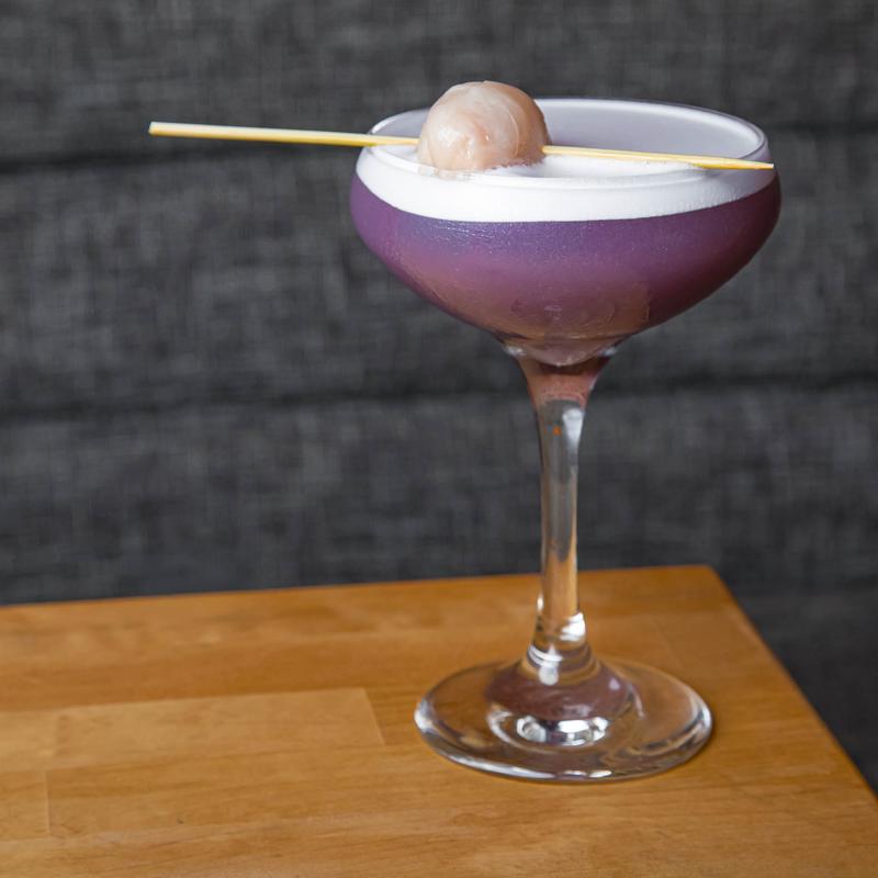 Roku gin, lemon, lychee, Chambord, violette, elderflower, egg white.